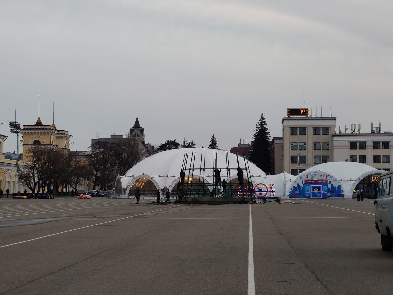 Рядом с главной елкой маленькие жители краевого центра могут сходить в гости к Деду Морозу в его резиденцию. Там же находятся небольшие домики, где можно купить кофе или перекус. Они подсвечиваются гирляндами.