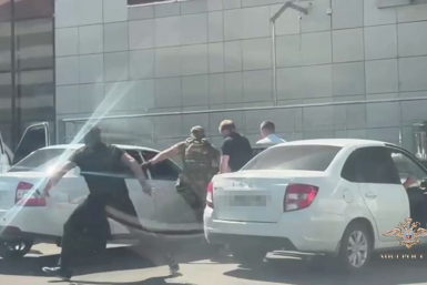 Заметно также, что у одного участника конфликта на лице кровь. В конце ролика в кадре появляется третий человек.