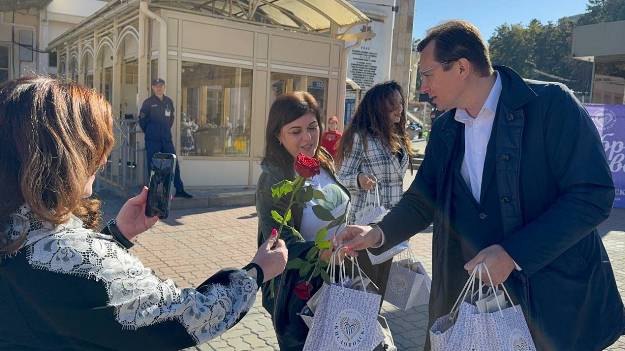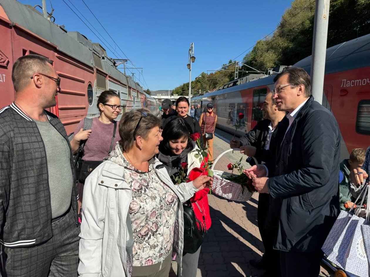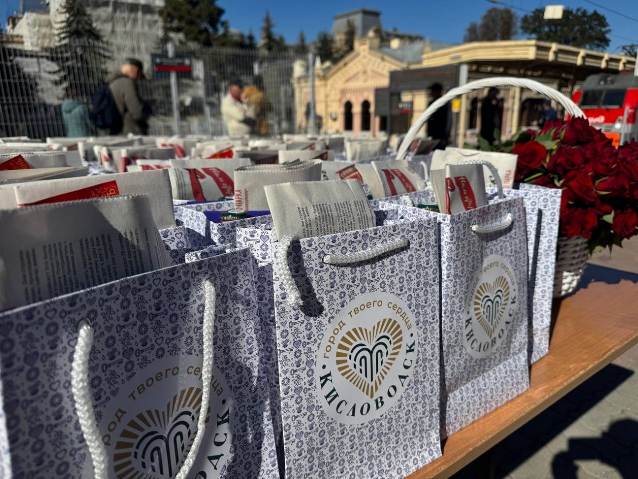 По традиции мэр Евгений Моисеев приехал на ж/д вокзал, чтобы встретить пассажиров поездов и вручить им брендированные подарки и цветы.