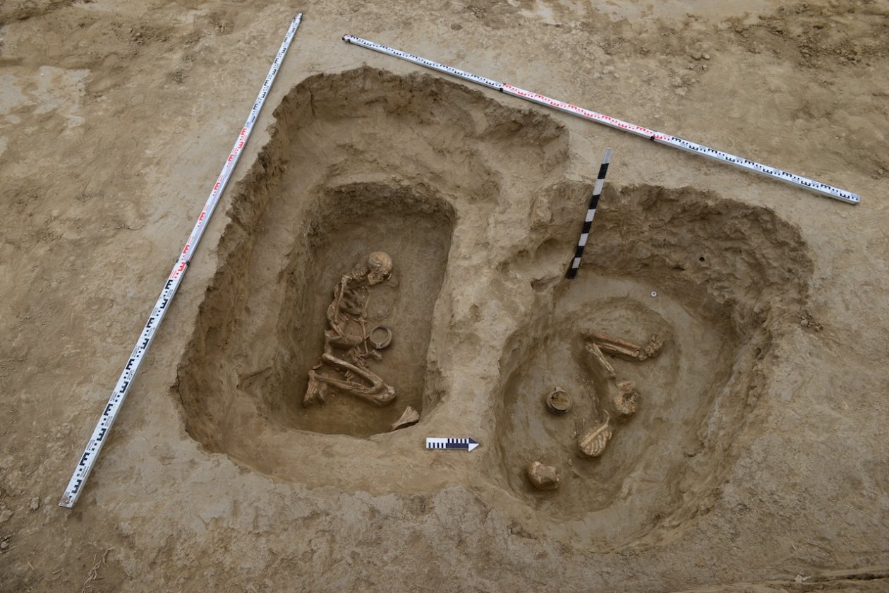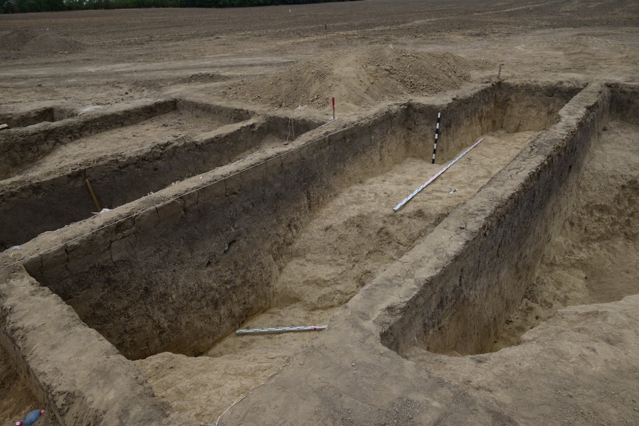 Используя данные аэрофотосъемки немецких военно-воздушных сил, сделанные во время Великой Отечественной войны, и современные спутниковые снимки, археологи обнаружили два объекта. Первый они обозначили как ритуальное сооружение №1 — это крупное кольцо внешним диаметром около 40 метров. Изначально его окружал вал, но он был полностью уничтожен многолетней распашкой. В заполнении рва ученые нашли кости крупного рогатого скота, овец и лошадей, фрагменты керамики и обломки ритуальных предметов — зернотерок и жертвенников. В центре площадки была обнаружена специальная жертвенная яма-ботрос с развалом крупного горшка и костями лошади.
