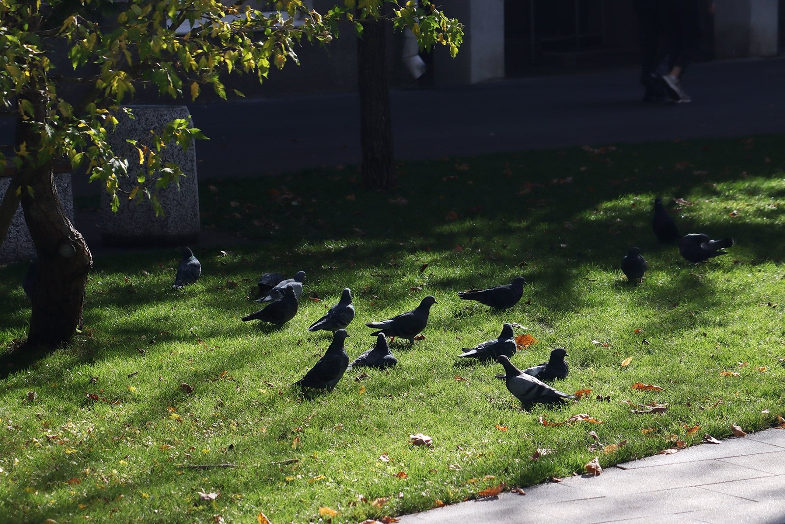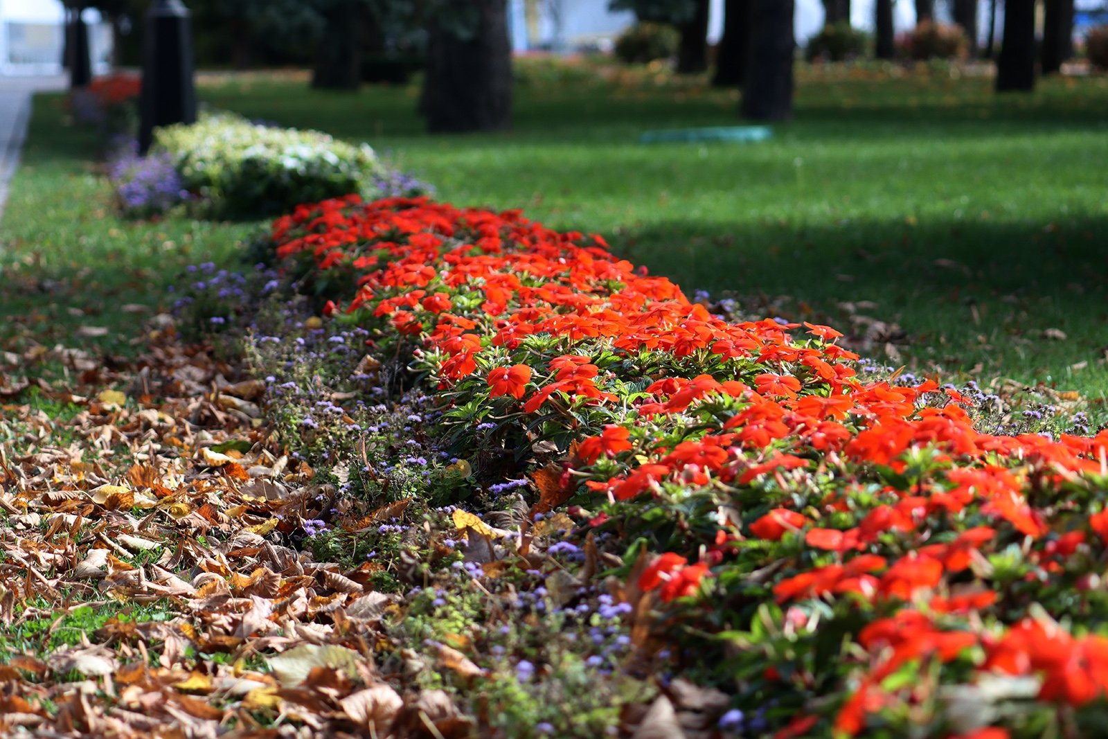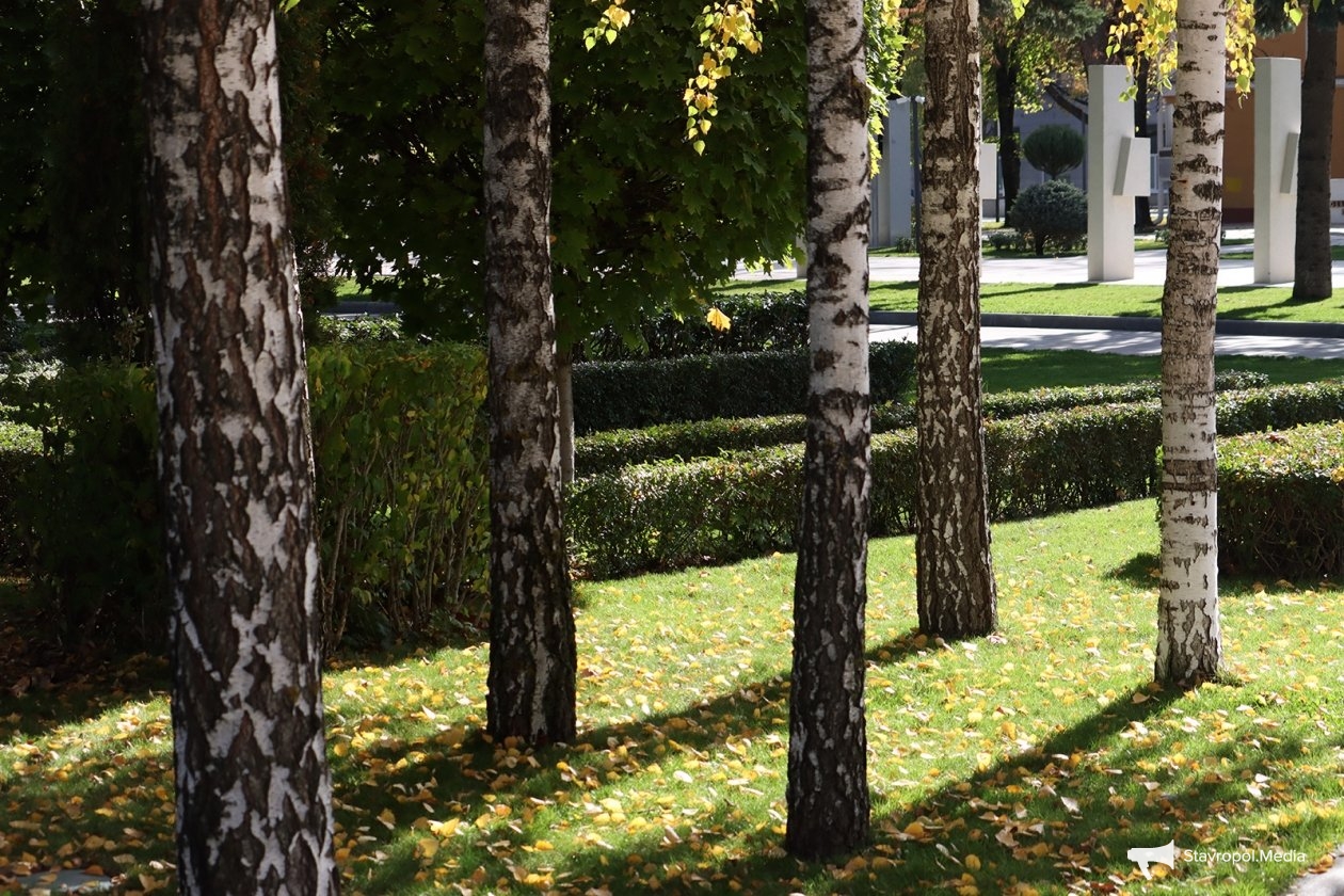 Заморозков в Ставрополе этой осенью ещё не было, поэтому не везде ещё привычная для красно-жёлтых дней картина. К примеру, на площади Ленина и возле драматического театра по-прежнему благоухают клумбы. Но каштаны уже скинули пожухший лист и то и дело норовят "подбить" увесистыми плодами прохожих. Орехами усеяна земля и тропинки. Клены уже радуют ярко жёлтой или красной кроной.