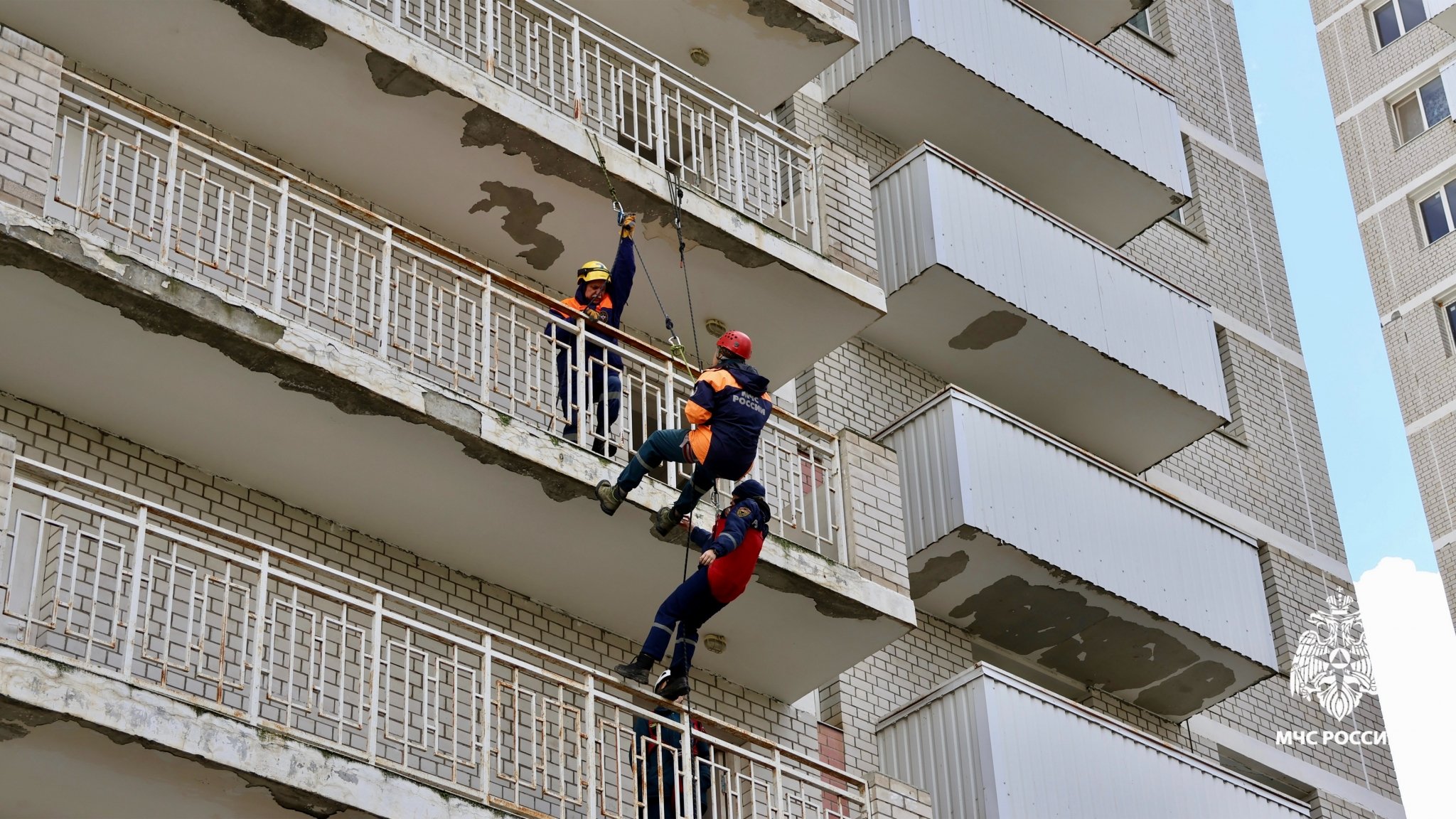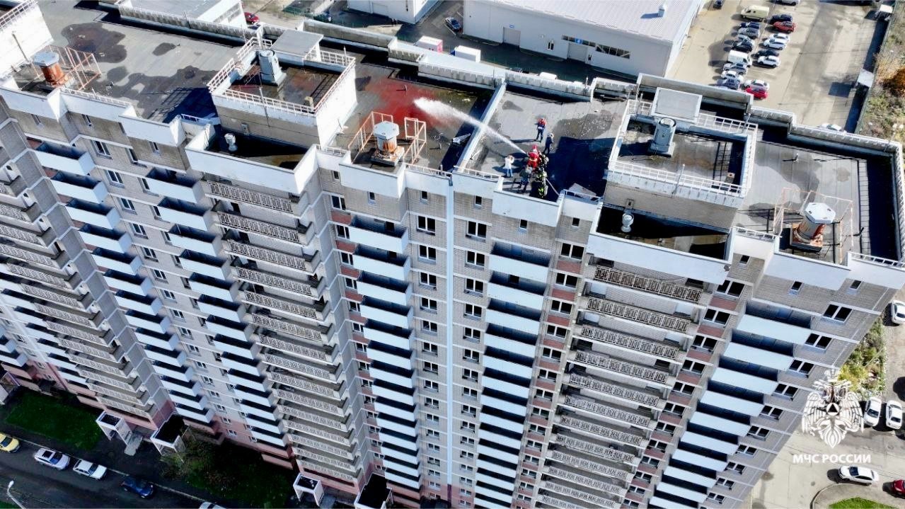 Основная задача — отрепетировать разные вероятные способы подачи воды на высотку и спасение жильцов. Пожарные прокладывали путь к "очагу", а в это время спасатели десантировались с вертолета Ми-8 и помогли безопасно выйти из здания жителям — их играли статисты.