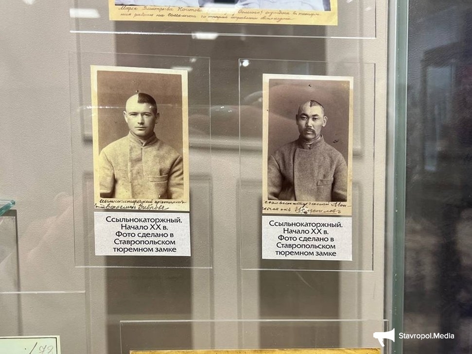 Привлекают внимание и фотографии ссыльнокаторжных, сделанные в Ставропольском тюремном замке в начале ХХ века. Голова у заключённых побрита ровно наполовину с одного бока.
