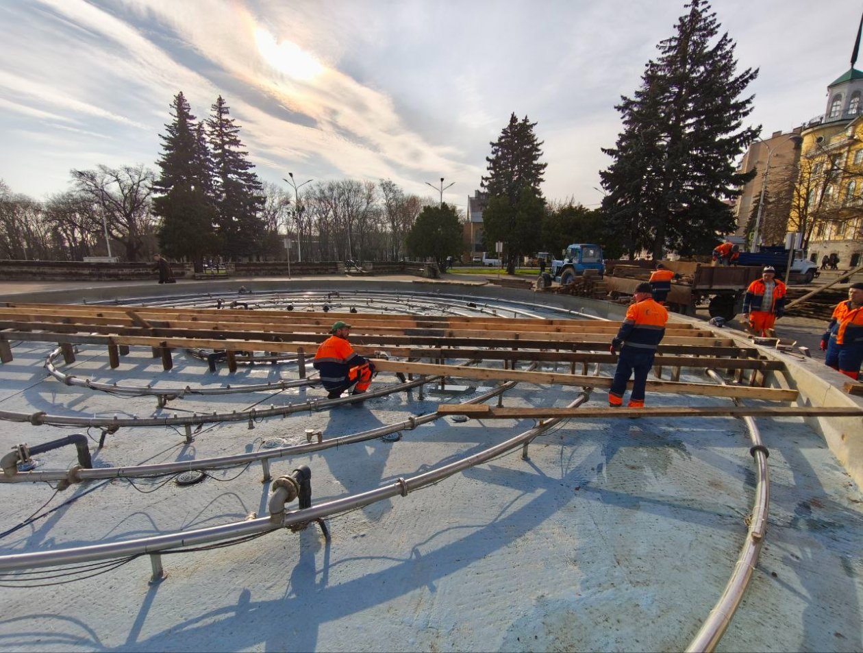 "Приступили к установке зимних инсталляций фонтанов. На Александровской площади уже появляются конструкции, напоминающие водные потоки, а на Крепостной горе рабочие монтируют основание на чаше фонтана для установки каркаса новогодней иллюминации", — говорится в сообщении.