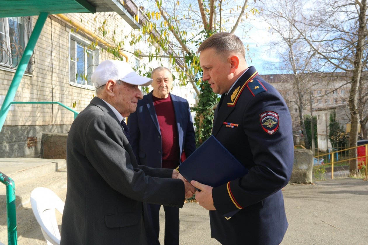 К 100-летию полицейские вручили ветерану приветственный адрес и подарок, за что Виктор Глушков тепло поблагодарил правоохранителей.