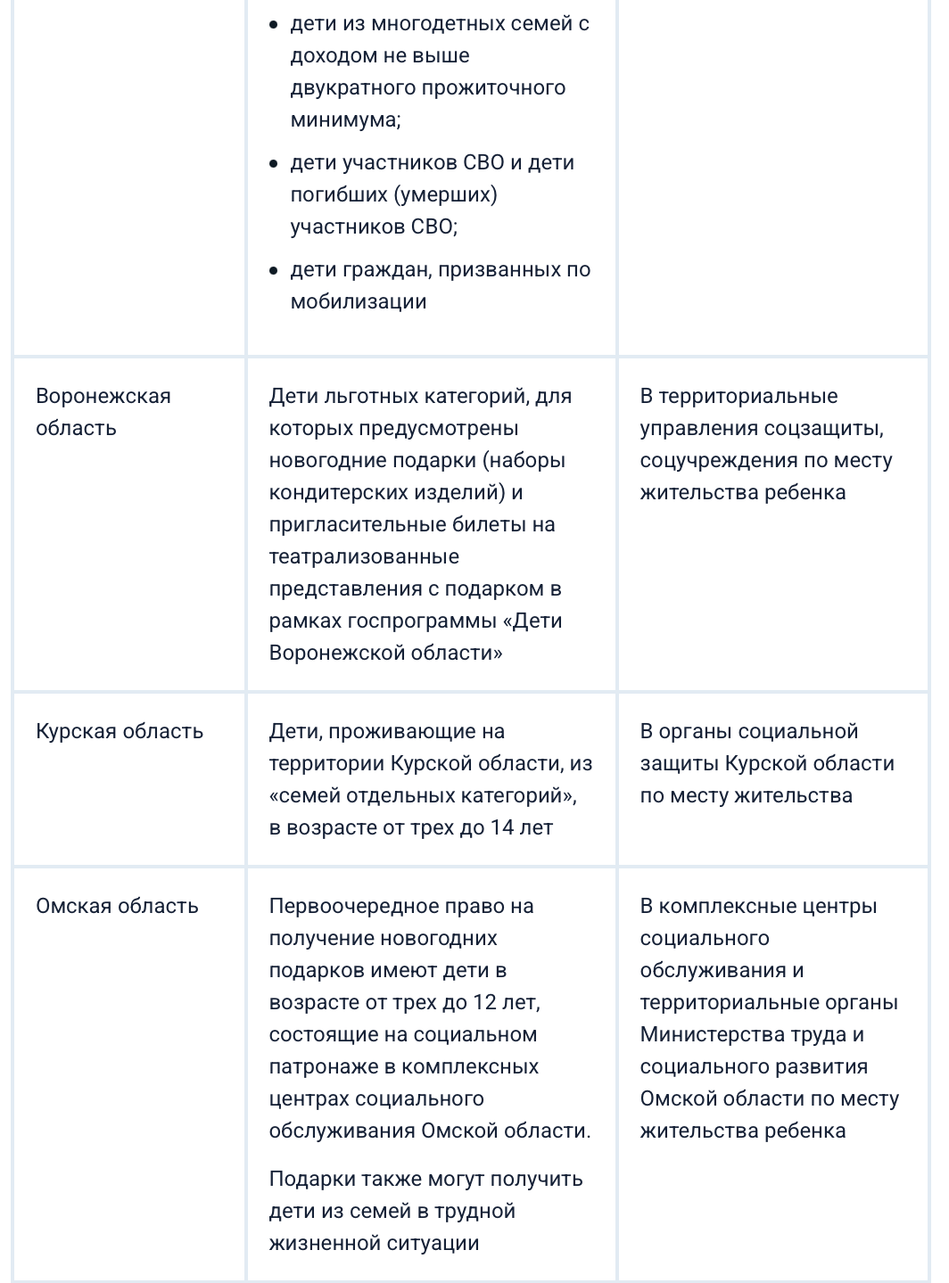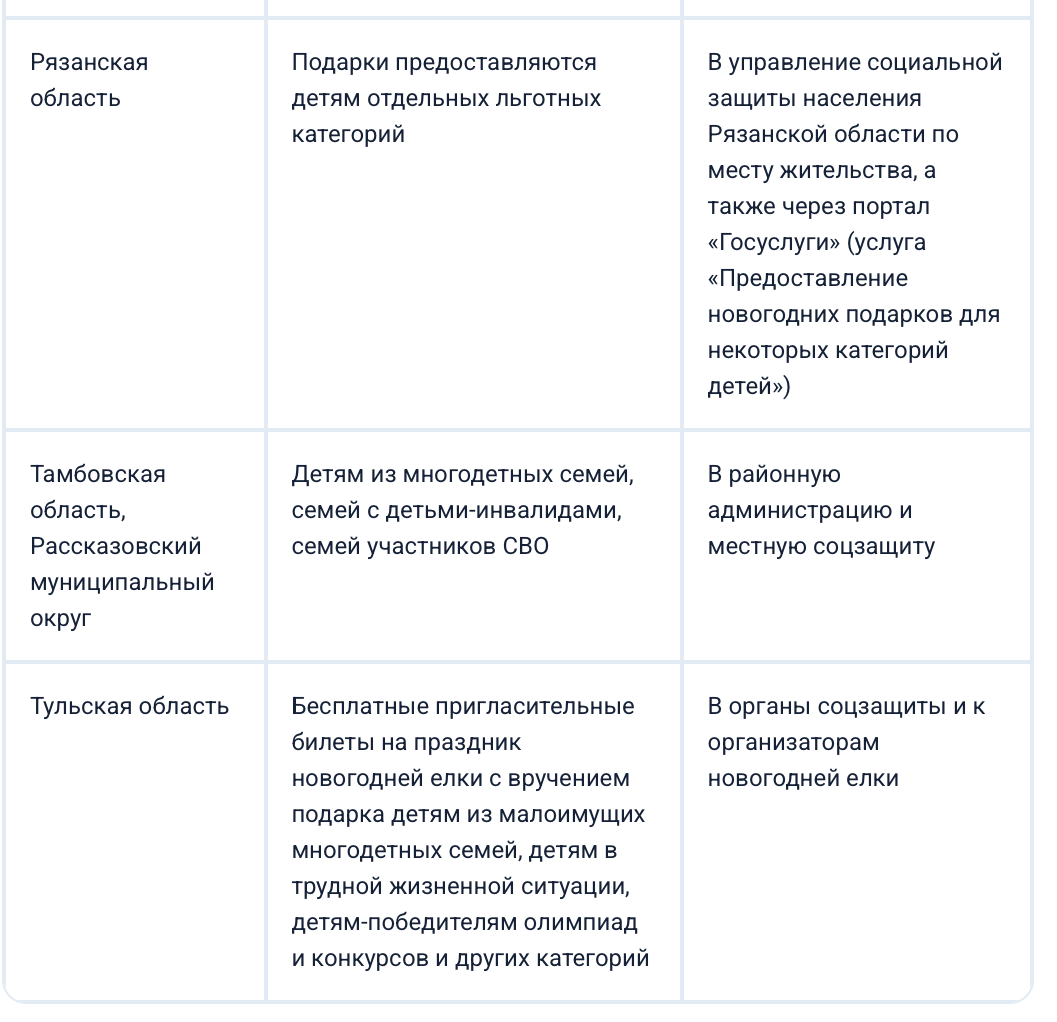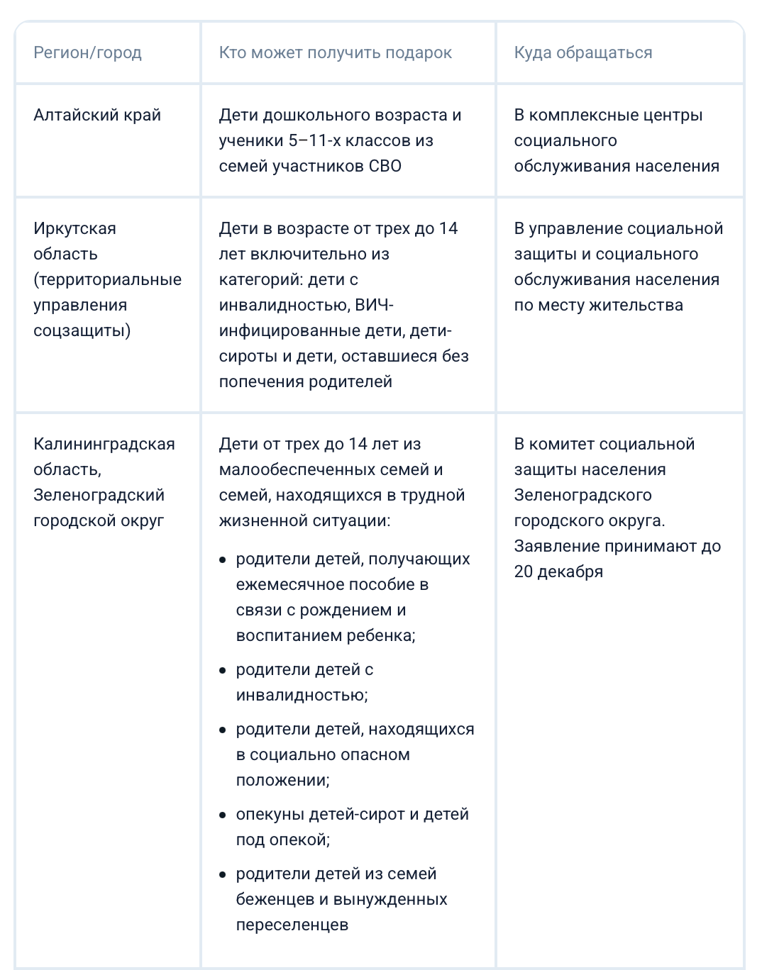 Подарки могут вручать работодатели родителей или профсоюзы. Условия определяются внутренними правилами организации. Также работает благотворительная акция "Елка желаний" (6+), через которую дети, у которых сложные жизненные обстоятельства, могут загадать желание. Заявки принимаются до примерно 20 декабря 2025 года.