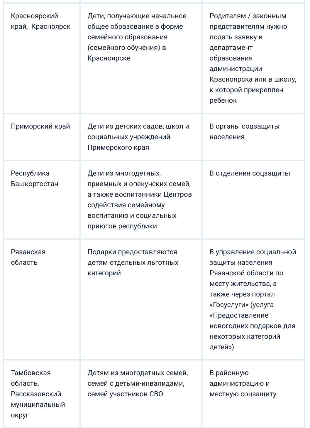 К новогодним праздникам отдельные категории семей с детьми могут претендовать на бесплатные подарки. В некоторых субъектах их распределяют централизованно, а в других — необходимо лично обратиться в органы соцзащиты. А вот на их сайтах или непосредственно на месте можно найти информацию, какие группы детей получат подарки. Отметим, что единых требований по стране нет. Но чаще всего поддержку получают дети из социально уязвимых семей или имеющие особый статус, пишет banki.ru.