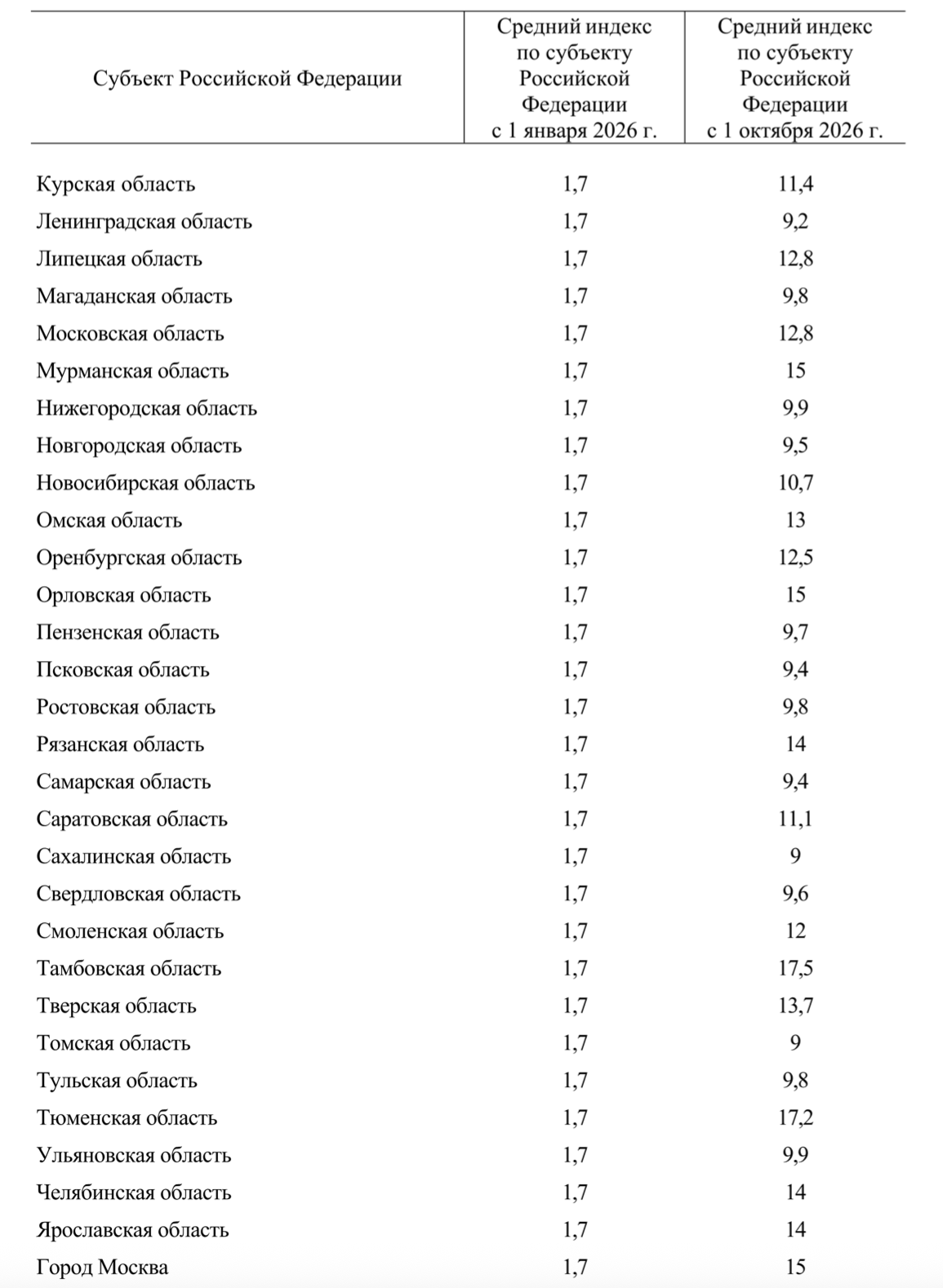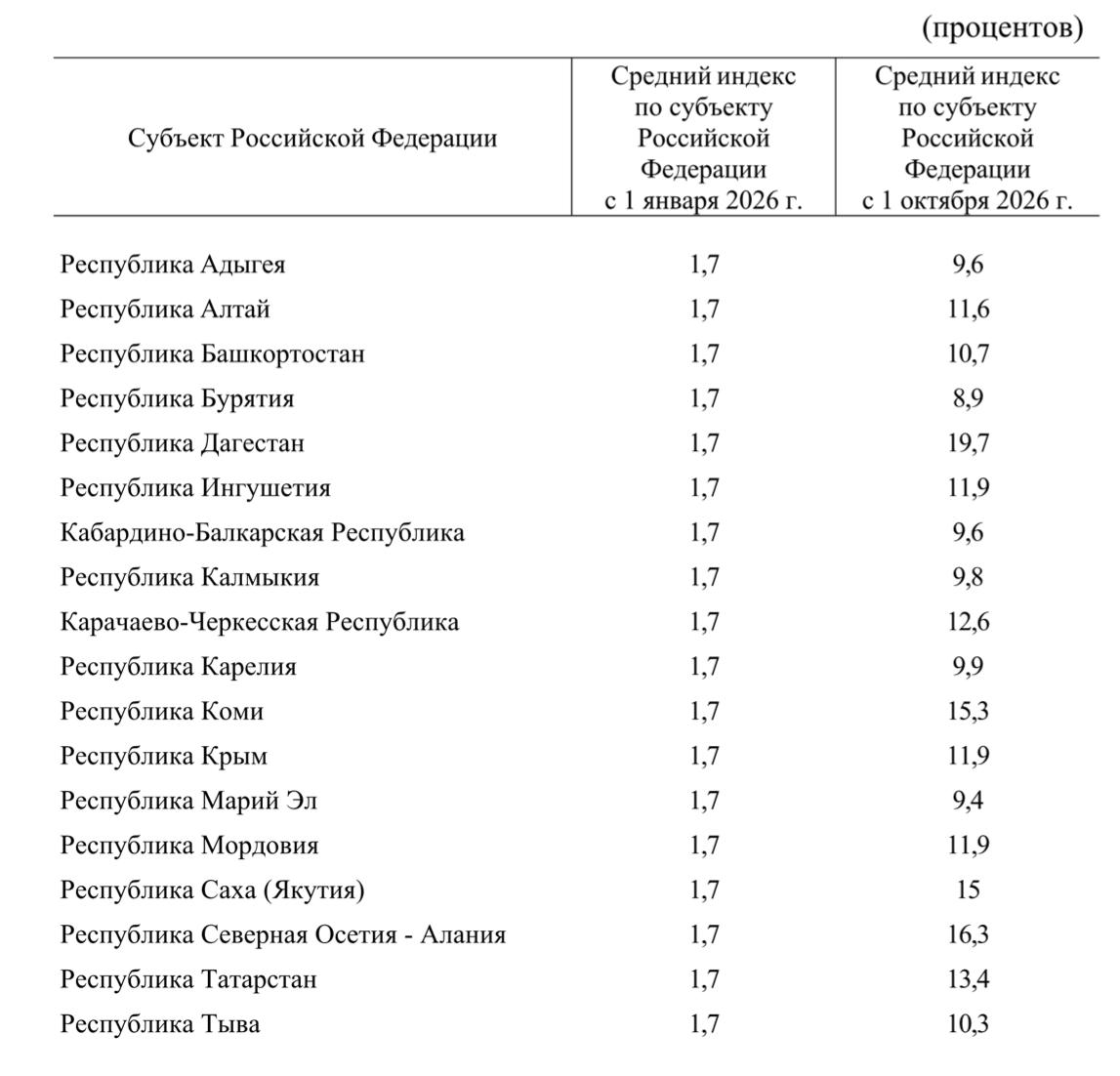 В следующем году тарифы ЖКХ повысят два раза. Но даты, когда будет увеличение, изменятся. Если раньше второй рост происходил летом, то теперь он будет осенью. С 1 января 2026 года максимальный рост тарифов ЖКХ по России составит 1,7% (в связи с увеличением НДС). Более серьезное подорожание будет 1 октября. Индекс роста о регионам может составить от 8% до 19,7%. Наибольшие значения установлены для Ставропольского края (22%) и Республики Дагестан (19,7%). Информацию по другим регионам ищите в таблице.