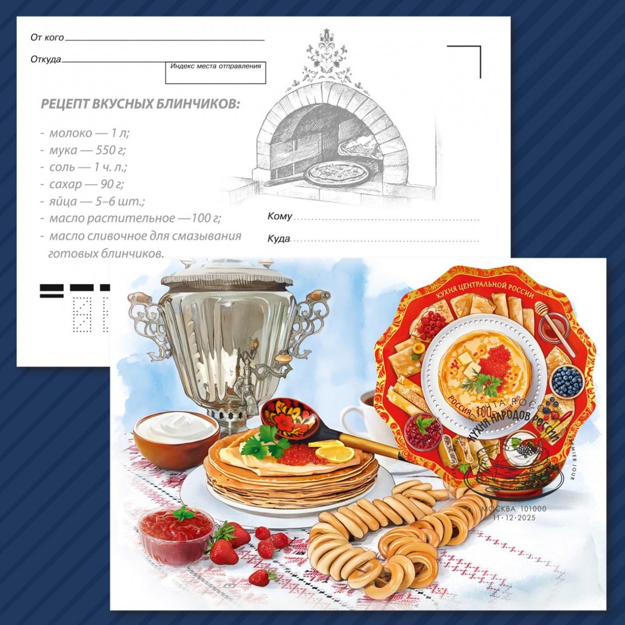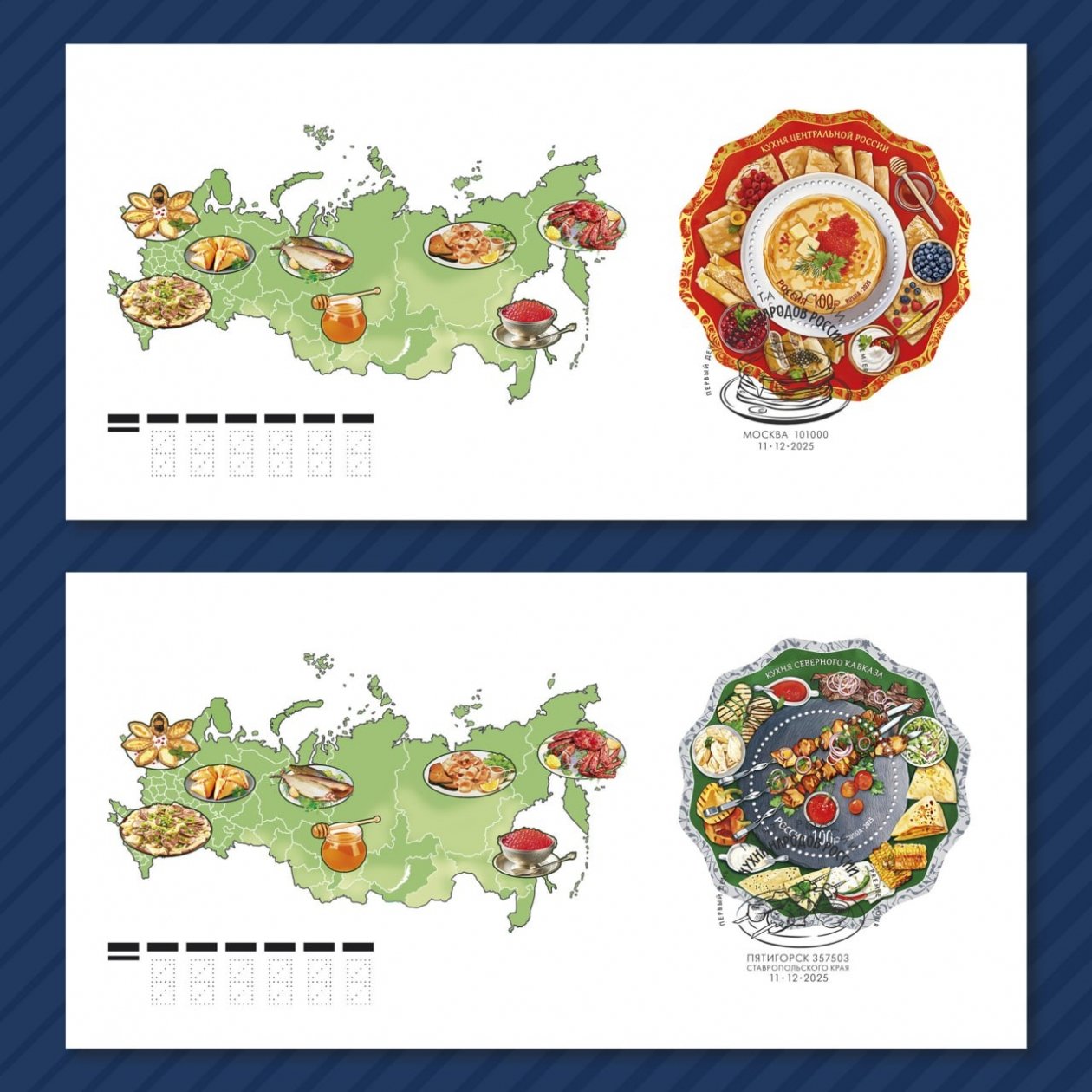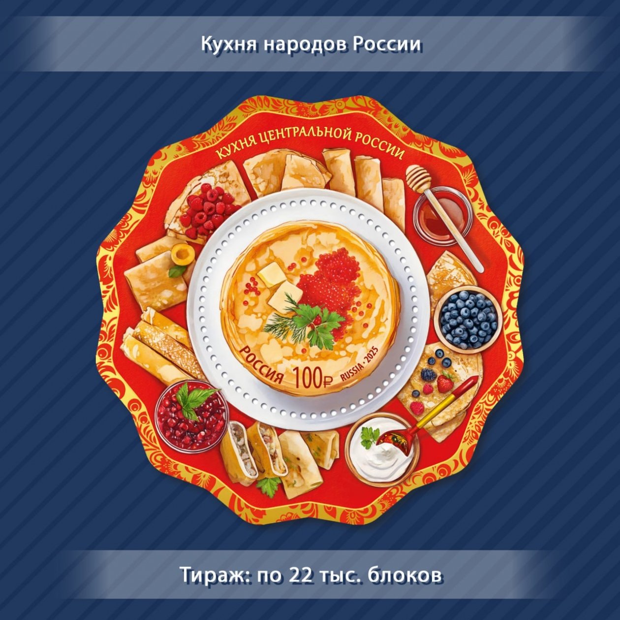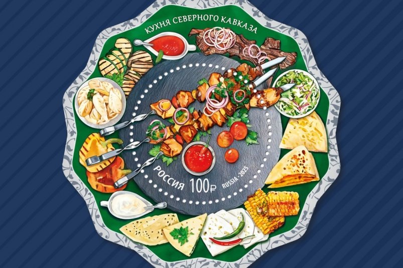 "На марках представлены блины и шашлык как ключевые блюда русской и кавказской кухонь, что подчёркивает богатство и единство гастрономической культуры России", — говорится в сообщении.