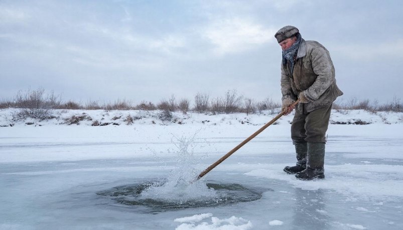 Сначала очистите лунку от снежной каши. Опустите палку (или ручку черпака) в воду на 30–50 сантиметров. Важно держать её не за самый кончик, а зажать между указательным и большим пальцем, не создавая лишних помех. Подождите 15–20 секунд. Не нужно стучать по воде или дну. Просто держите палку неподвижно.