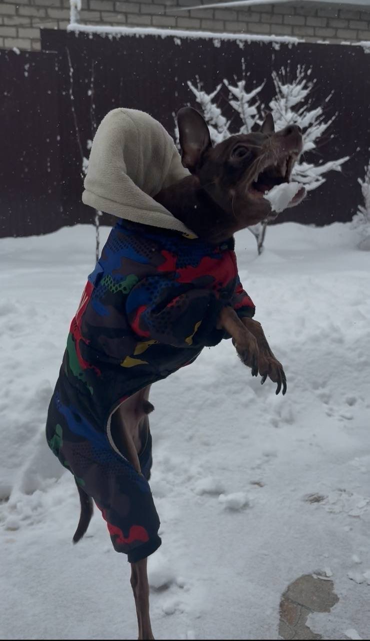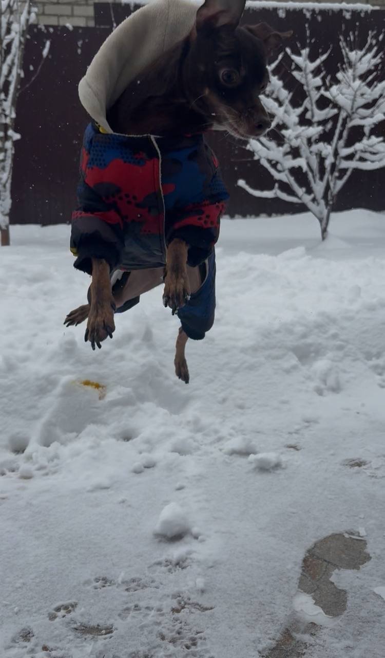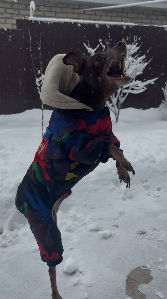 В последние дни декабря в регионе наконец установилась снежная погода. Наш герой Тимоша не скрывал радости и скорее побежал на улицу. Чтобы питомец не замёрз, хозяйка надела на него тёплый комбинезон и выпустила во двор.