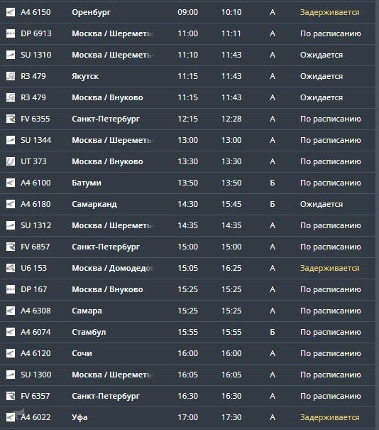 В аэропорту Ставрополя отложены вылет в Санкт-Петербург и прибытие рейса из этого же города. В Минеральных Водах задерживаются вылет в Москву, а также прилёт самолётов из Оренбурга, Москвы и Уфы.