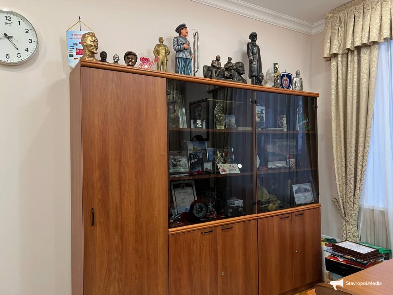 Гостей сразу впечатлил кабинет Виктора Ивановича. Первое, что бросается в глаза, — обилие памятных предметов. Портреты, бюсты, знамёна, полевой телефон, найденный при раскопках в Курском округе, книги и награды создают ощущение, будто журналисты попали не в рабочее пространство, а в настоящий музей. Большинство экспонатов — подарки от жителей края, ветеранов, общественных организаций и коллег из других регионов. Коллекция формируется с 1995 года.