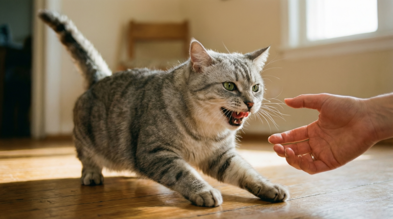 Если кошка укусила, не отдергивайте руку. Это может усилить ее реакцию. Лучше замереть или слегка продвинуть руку вперед. Это смутит животное, и оно разожмет зубы.
