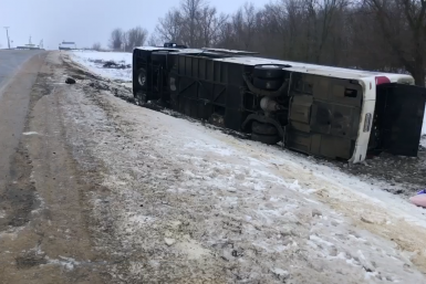 Инцидент произошёл сегодня утром на дороге со стороны села Красная Поляна в направлении села Тахта. По предварительным данным, водитель рейсового автобуса "Севастополь — Астрахань" не справился с управлением, его занесло, а затем транспорт опрокинулся.