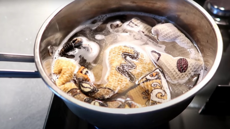 Выключите огонь и оставьте полотенце в воде до её полного остывания. За это время вы заметите, как жидкость в кастрюле станет мутной — это признак того, что средство эффективно вытягивает грязь.