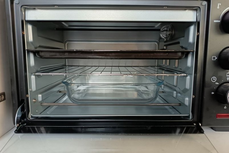 - Поставьте форму на нижнюю решетку духовки, включите на 90–100°C на 30–45 минут и закройте дверцу.