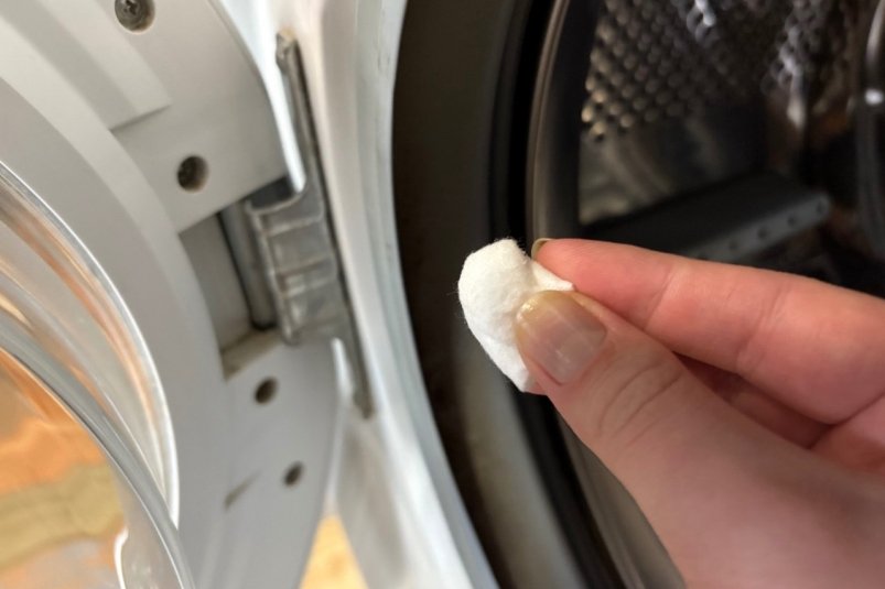 Достаньте вату и протрите уплотнитель чистой влажной салфеткой. Для лучшего эффекта запустите пустую стирку на высоких температурах.