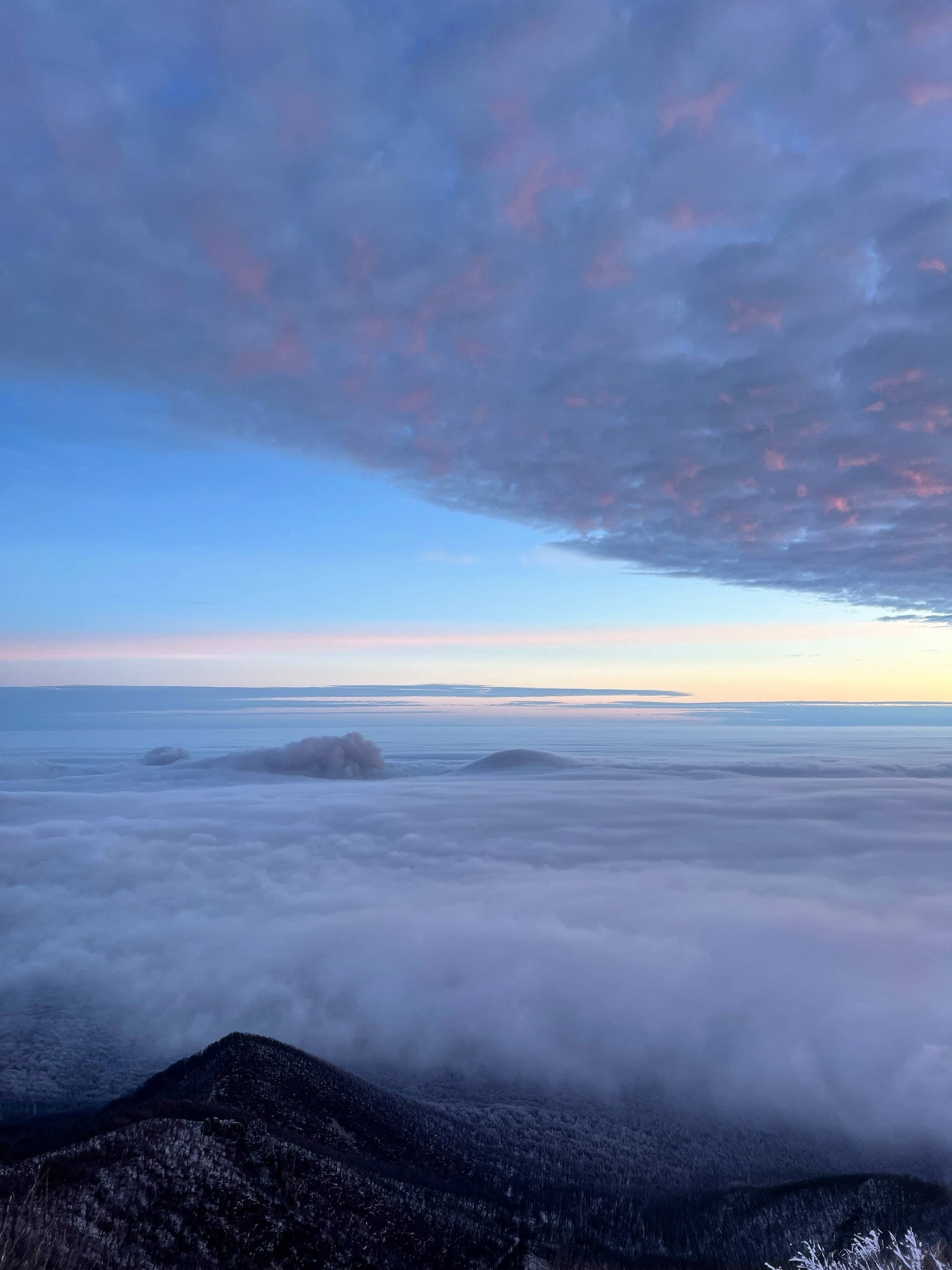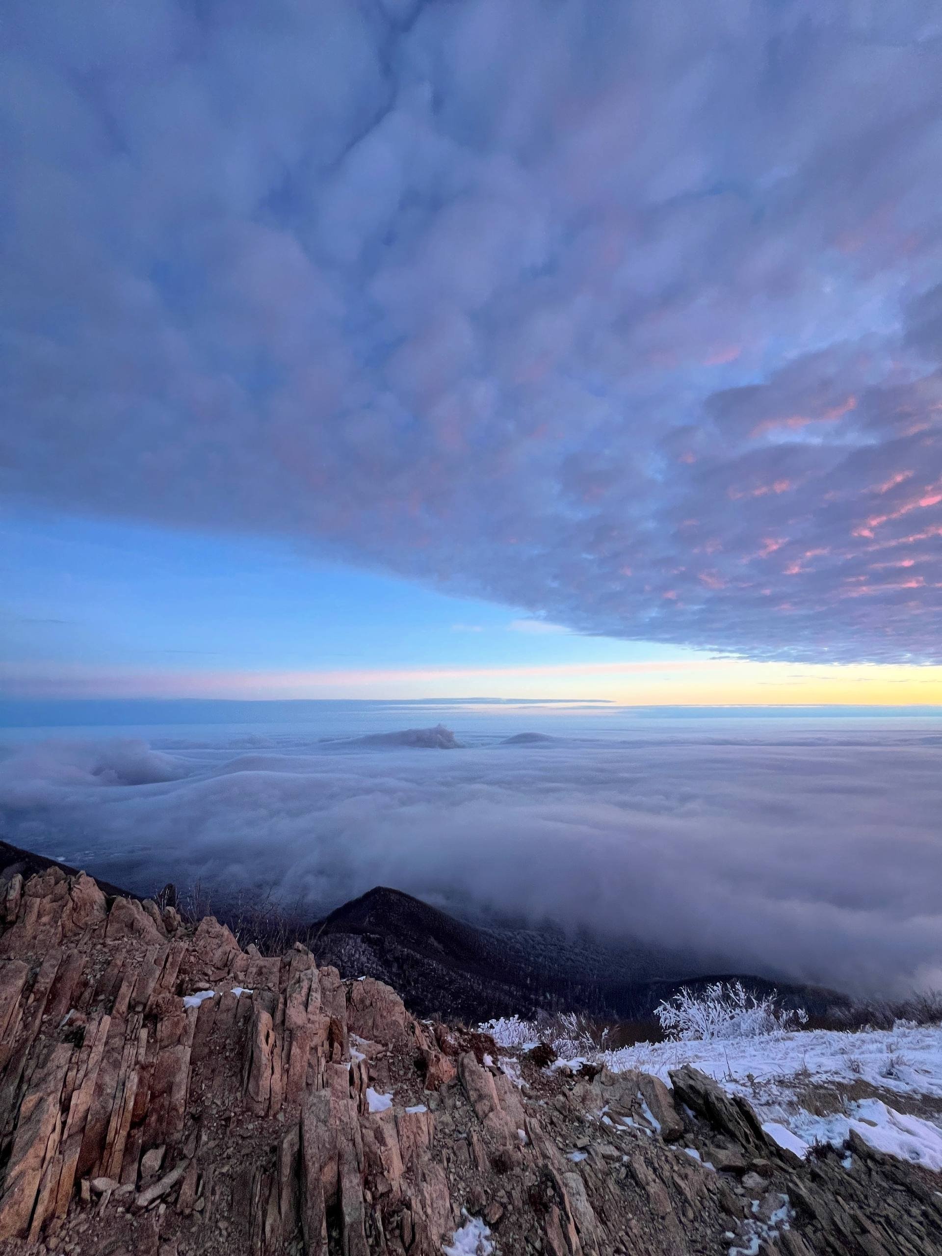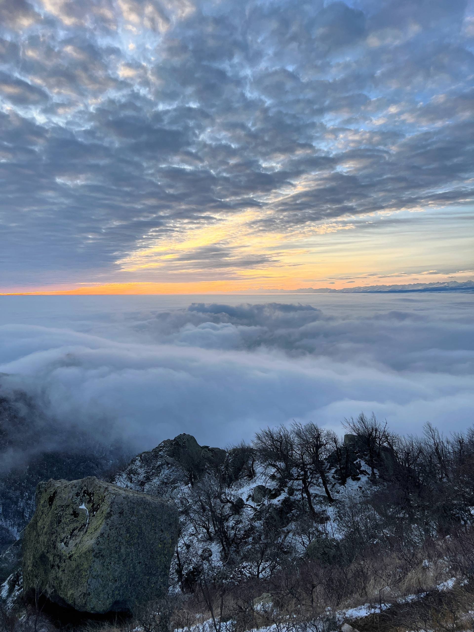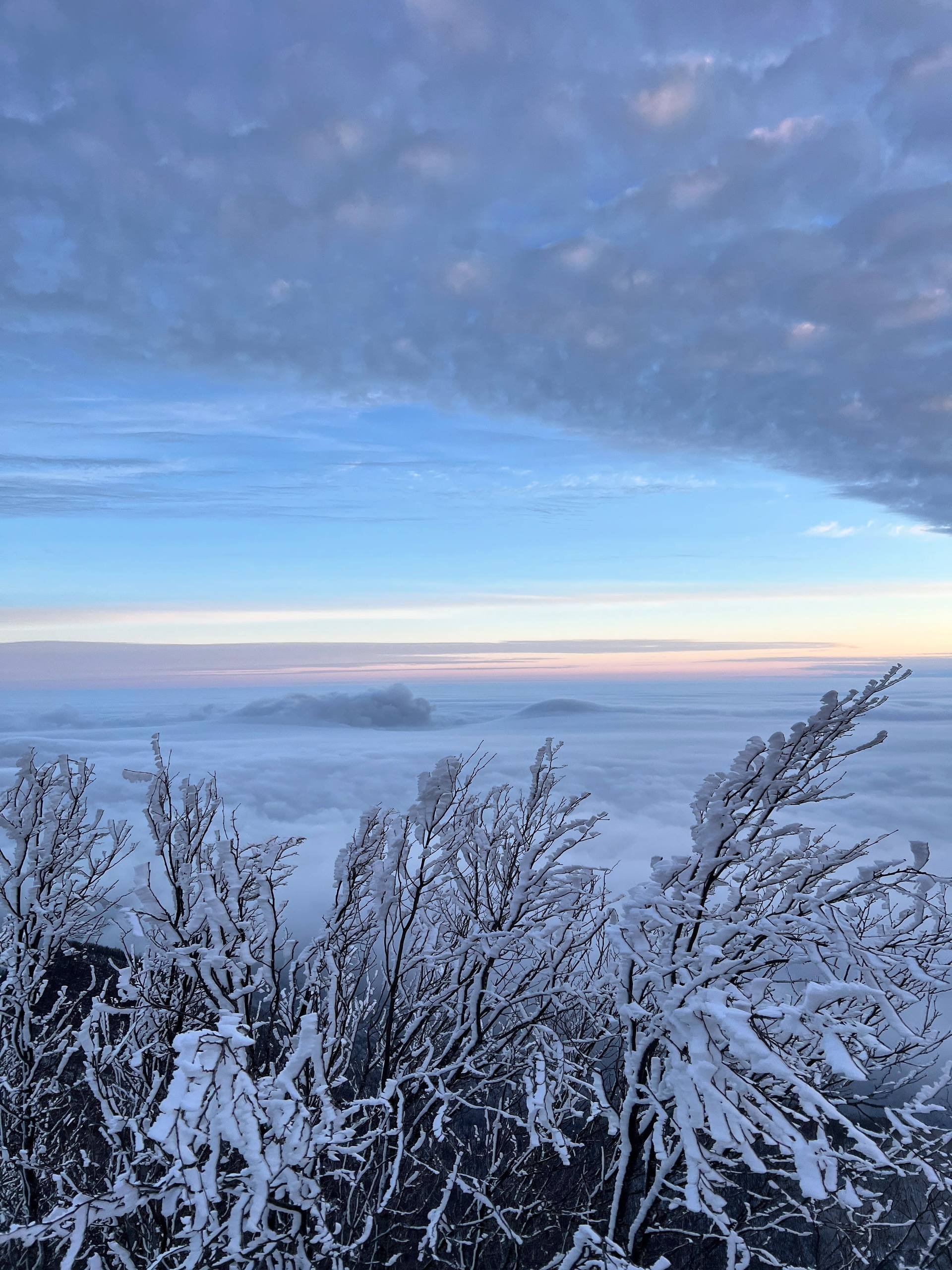 Белоснежная трава, обледенелые деревья и горы, утопающие в облаках на рассвете — вид с вершины Бештау завораживает. Морозный воздух и яркое солнце создают ощущение волшебства, которое кажется недоступным. Для тех, кто не может подняться на вершину лично, ставропольский фотограф Артём Галактионов запечатлел невероятный вид на Кавминводы. Особенно впечатляет контраст между морозной белизной снега и тёплыми розовыми оттенками рассвета, а самые внимательные могут разглядеть красавца Эльбруса.