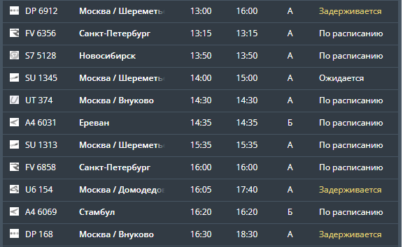 В воздушную гавань Минеральных Вод к данной минуте вовремя не могут прибыть восемь самолетов — из Нижневартовска, Екатеринбурга, Москвы (Шереметьево, Домодедово, Внуково), Самары, Антальи. Отменен рейс из Стамбула. Вылет задерживается в Москву в аэропорты Шереметьево, Домодедово и Внуково.