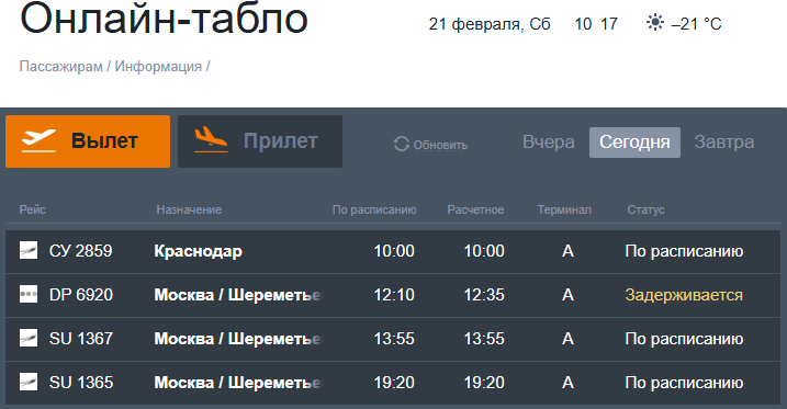 В Ставрополе с опозданием прибывает и вылетает рейс, курсирующий между краевым центром и Москвой (Шереметьево). Не исключено, что это связано с последствиями мощного снегопада, который выпал накануне в столице страны.