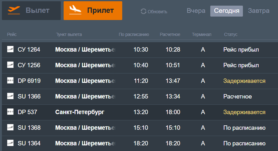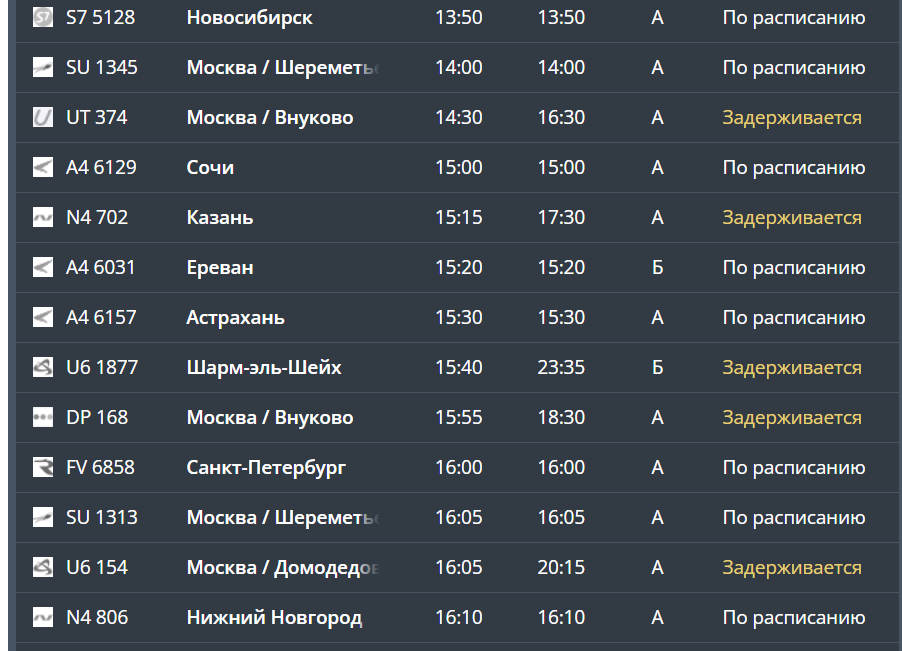 В аэропорт Ставрополя с опозданием выполняются четыре рейса: два на вылет — в Москву и Санкт-Петербург, и два на прилёт из этих же городов.
