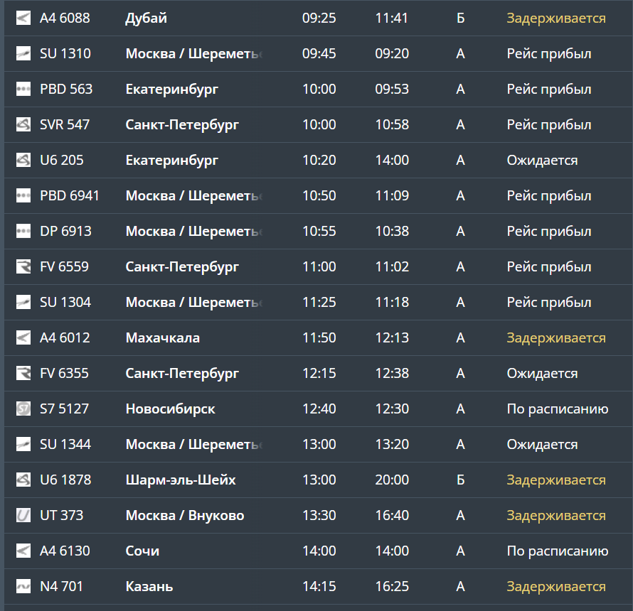 В аэропорту Минеральных Вод задерживаются 19 рейсов. С опозданием вылетают самолёты в Екатеринбург, Москву, Казань и Шарм-эль-Шейх. Также с задержкой ожидается прибытие 11 рейсов из Пензы, Махачкалы, Москвы, Шарм-эль-Шейха, Казани и Стамбула.