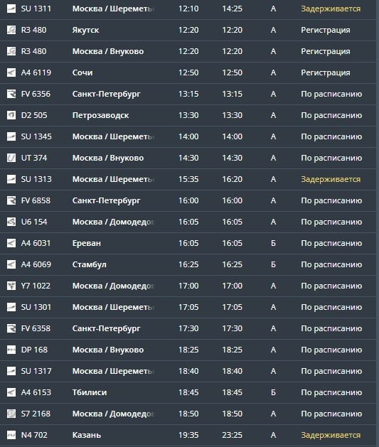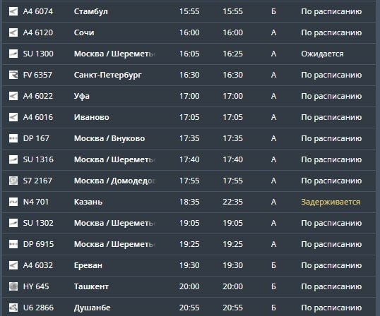 С опозданием ожидаются самолёты из Стамбула, Москвы и Казани. Также отменены рейсы из Сочи, Екатеринбурга и Самарканда.