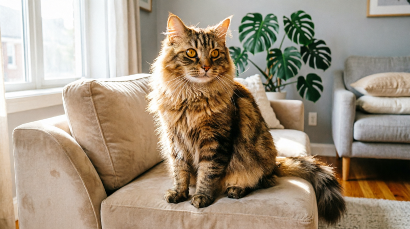 Главная особенность — густая длинная шерсть с плотным подшёрстком. Из-за этого кошка кажется намного крупнее, чем есть на самом деле. При весе около 3–4 килограммов она выглядит почти вдвое массивнее.