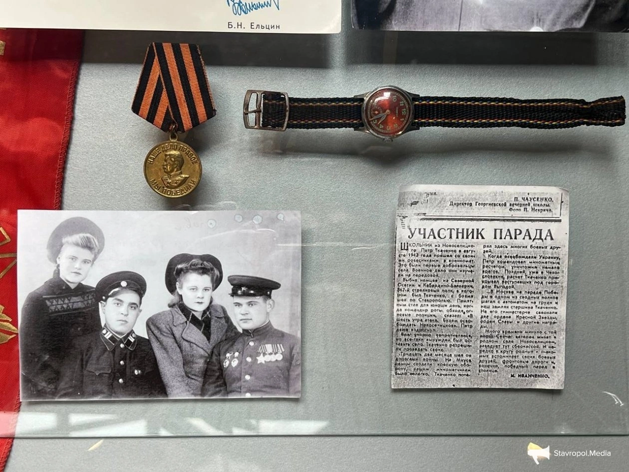 Ещё один герой экспозиции — Пётр Васильевич Ткаченко. Он ушёл на фронт добровольцем ещё будучи школьником, а военному делу обучался уже в боевых условиях. Ткаченко участвовал в Параде Победы 9 мая 1945 года на Красной площади в Москве. Его награды — два ордена Красной Звезды и орден Славы III степени — свидетельствуют о проявленном мужестве. Ленту, с которой он прошёл по Красной площади, ветеран лично передал в музей.