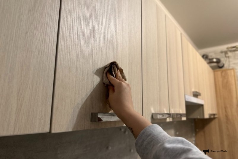 Получившийся раствор заливают в пульверизатор. Равномерно распыляют на загрязнённые поверхности шкафов — и оставляют ровно на три минуты. За это время химическая реакция уксуса и соды расщепляет жировые отложения буквально на молекулярном уровне. После остаётся только пройтись по фасадам влажной мягкой тряпкой. Никакого нажима, никакой абразивной губки. Грязь уходит сама, как будто её и не было.