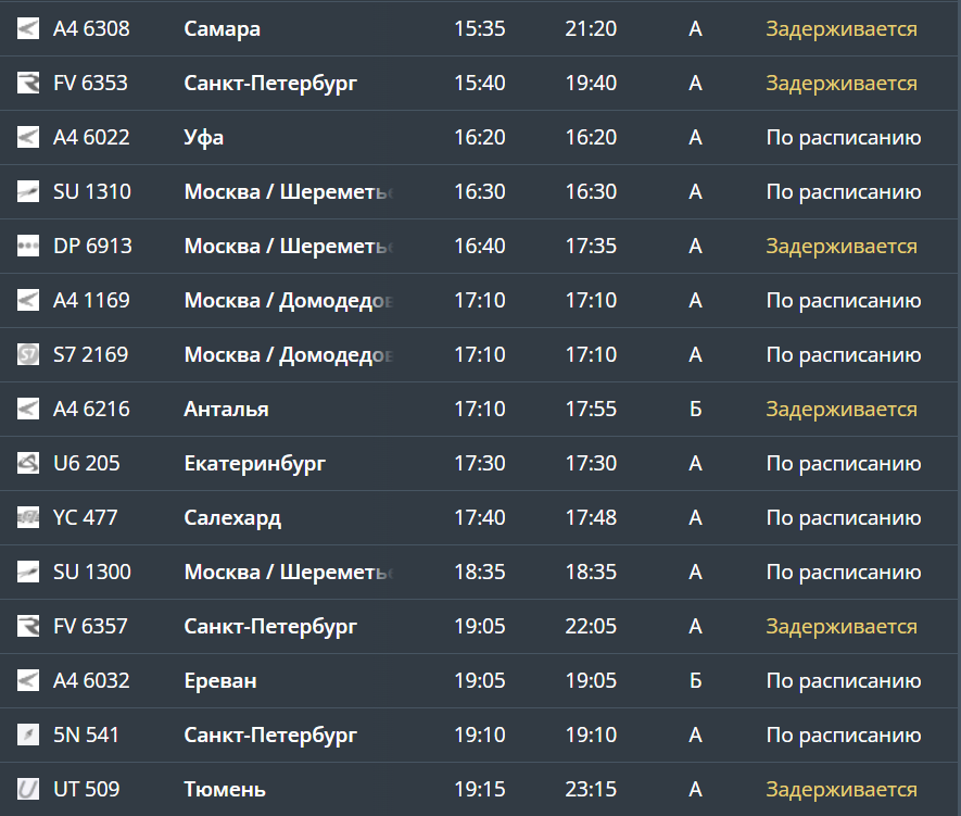 С задержкой вылетят пять самолётов. Большая часть из них в Москву и Санкт-Петербург, один — в Тюмень.