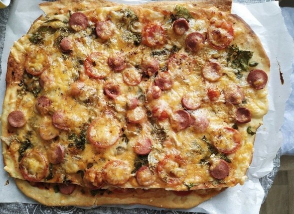 - Достаньте готовую пиццу из духовки, нарежьте на порционные кусочки и подавайте горячей.