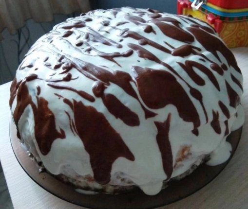 - Украсьте торт глазурью. Полейте торт теплой глазурью, стараясь равномерно распределить её по темным кусочкам, чтобы создать эффект "кучеров".