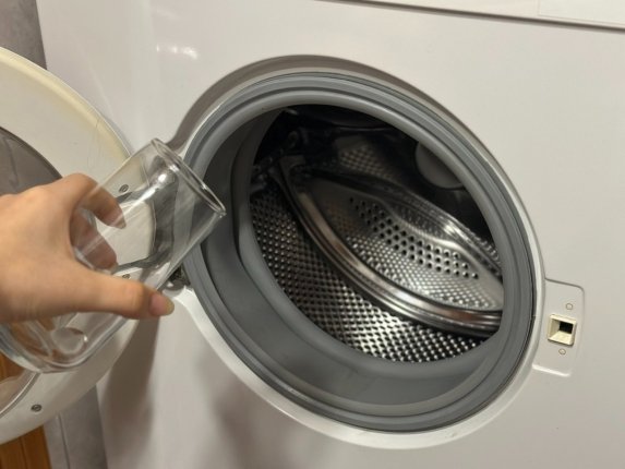 - Налейте 1 стакан уксуса (9%) прямо в барабан стиральной машины. Уксус помогает растворять отложения и убивает неприятные запахи. Он является отличным натуральным дезинфицирующим средством, которое очистит трубки и фильтры от накопленных загрязнений.