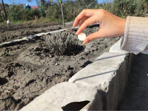 Слегка перемешайте уголь с почвой. Что поможет улучшить структуру грунта и равномерно распределить уголь в лунке.