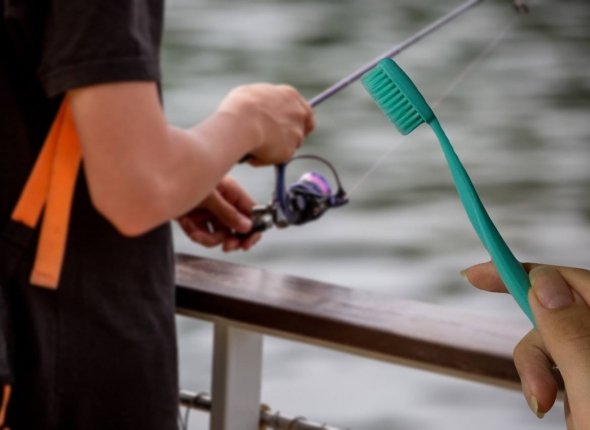- Рыбак делает заброс и после падения приманки на дно берет зубную щетку