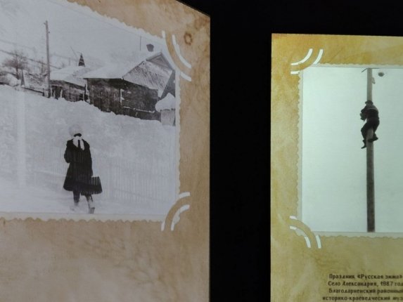 Фотография из Благодарненского районного историко-краеведческого музея снова показывает праздник "Русская зима" — на этот раз в 1987 году в селе Александрия. В кадре позднесоветской эпохи — мужчина, лезущий на столб за подарком в традициях старинных забав.