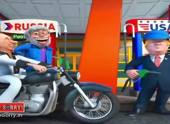 Затем сюжет переходит к сцене у двух бензоколонок, обозначенных как "Россия" и "США". Рядом со второй изображен президент США Дональд Трамп. Индийский лидер в ролике заправляет транспортное средство из российской колонки, после чего они с Владимиром Путиным продолжают путь.