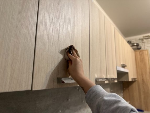 "У меня темно-серые глянцевые фасады. Смотрятся красиво, но это просто мука для хозяйки — на них виден каждый отпечаток пальца. Сделала все по рецепту и весь этот жир исчез сразу же. А самое главное — прошло три дня, а на шкафы почти не садится пыль"