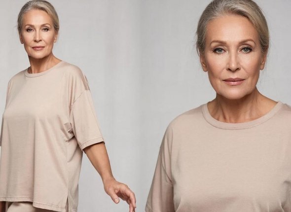Качественная ткань. Дешевая синтетика мгновенно удешевляет образ. После 50 стоит делать ставку на премиум-хлопок (пима, супима) или добавление шелка, модала, тенселя. Плотность ткани должна быть не ниже 160–180 г/м².