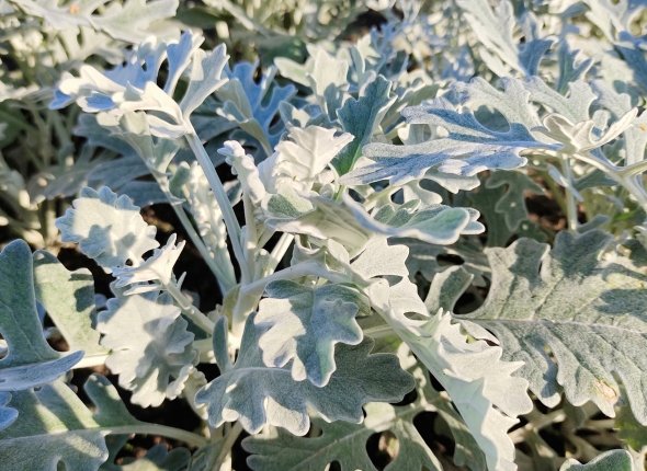 Эти компактные кустики вырастают всего до 30 см в высоту, что делает их идеальными для создания низких бордюров и акцентов. Главная ценность однолетника скрыта в роскошной листве, которая сохраняет свою декоративность на протяжении всего сезона. Если же цветки и появляются, то это обычно мелкие, невзрачные желтоватые соцветия, которые не отвлекают внимание от главной изюминки растения — его серебристой листвы.