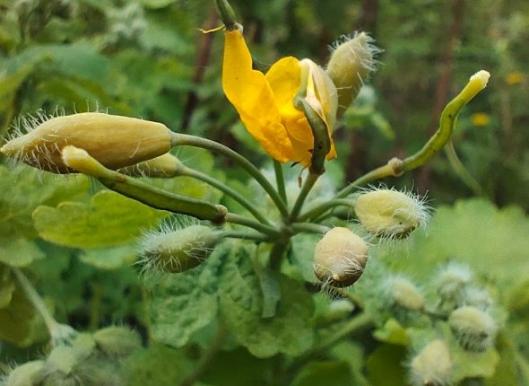 Цветет чистотел ярко-желтыми цветочками — каждый примерно с ноготь, с четырьмя лепестками. После цветения появляются стручки, которые лопаются и разбрасывают семена вокруг. За сезон так может повториться несколько раз.